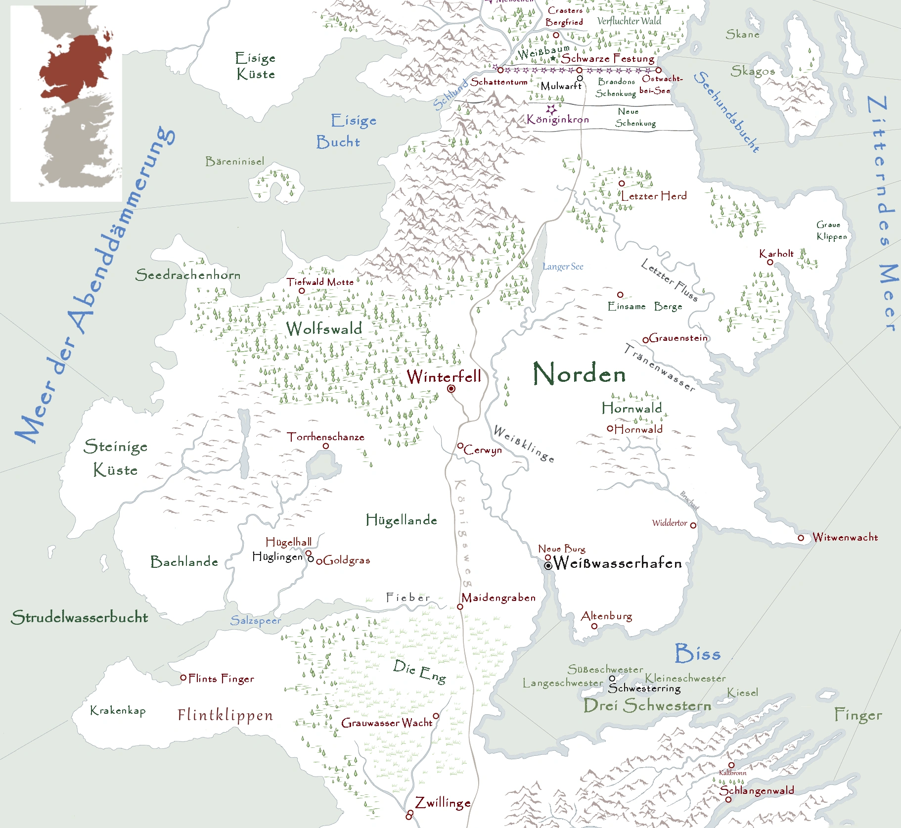 | Besiedlungen | Altenburg • Bruchsteinberg • Burg Cerwyn • Deepdown • Driftwood Hall • Flints Finger • Goldgras • Grauenstein • Grauwasser Wacht • Hornwald • Hüglingen (Hügelhall) • Karholt • Königshaus • Letzter Herd • Schwarzweiher • Tiefwald Motte • Torrhenschanze • Weißwasserhafen (Neue Burg - Wolfsbau) • Widdertor • Winterdorf • Winterfell • Witwenwacht |
