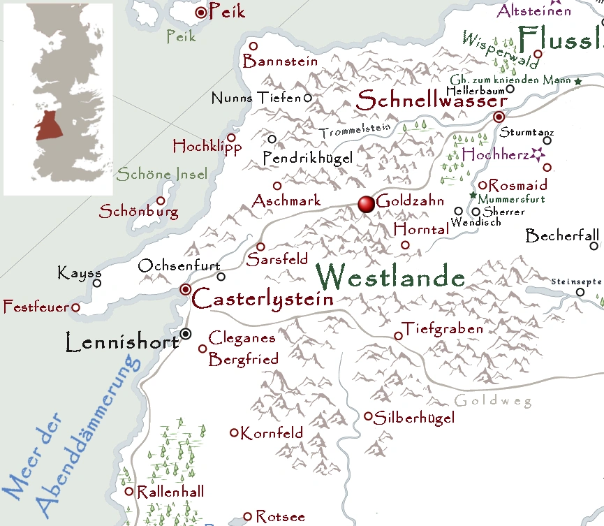 - ↑ Die Welt von Eis und Feuer, Karte von den Westlanden