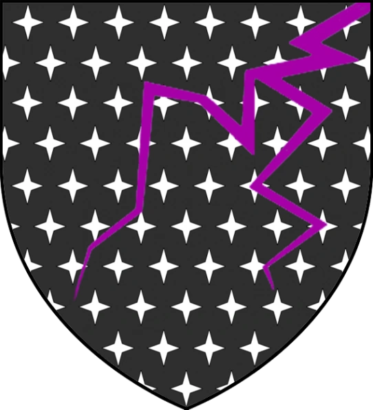 Das Wappen zeigt einen gegabelten violetten Blitz auf schwarzem Grund, übersät mit Sternen.[3]