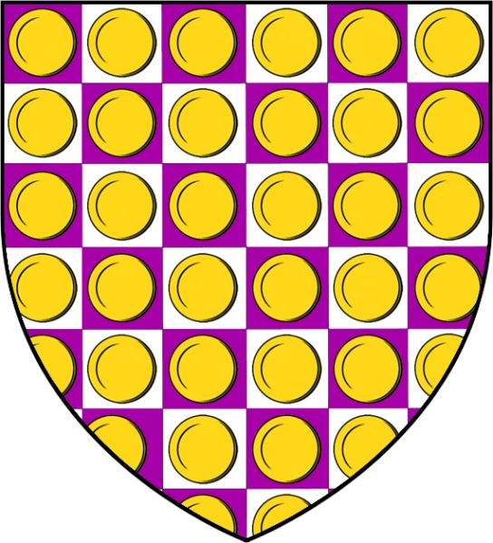 Das Wappen des Hauses zeigt purpurfarbene und weiße Karos mit Goldmünzen darin.[2]