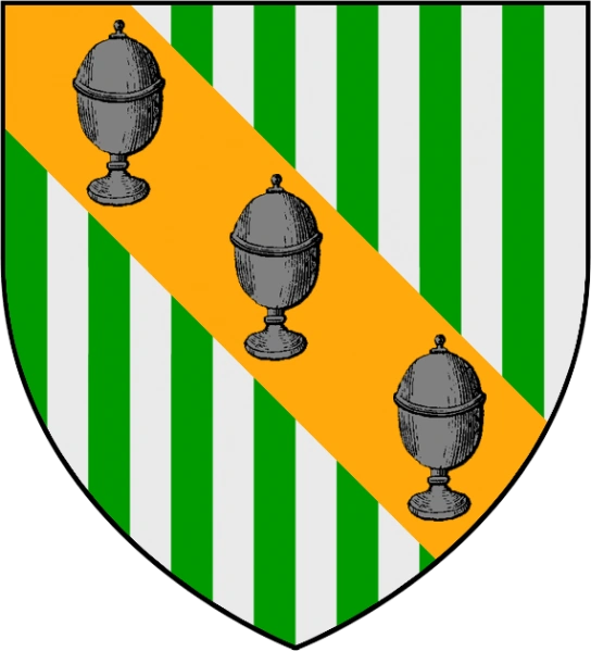 Das Wappen des Hauses zeigt drei schwarze Pfefferstreuer über einer Safranwurzel auf grün-silbern gestreiftem Grund.[2]