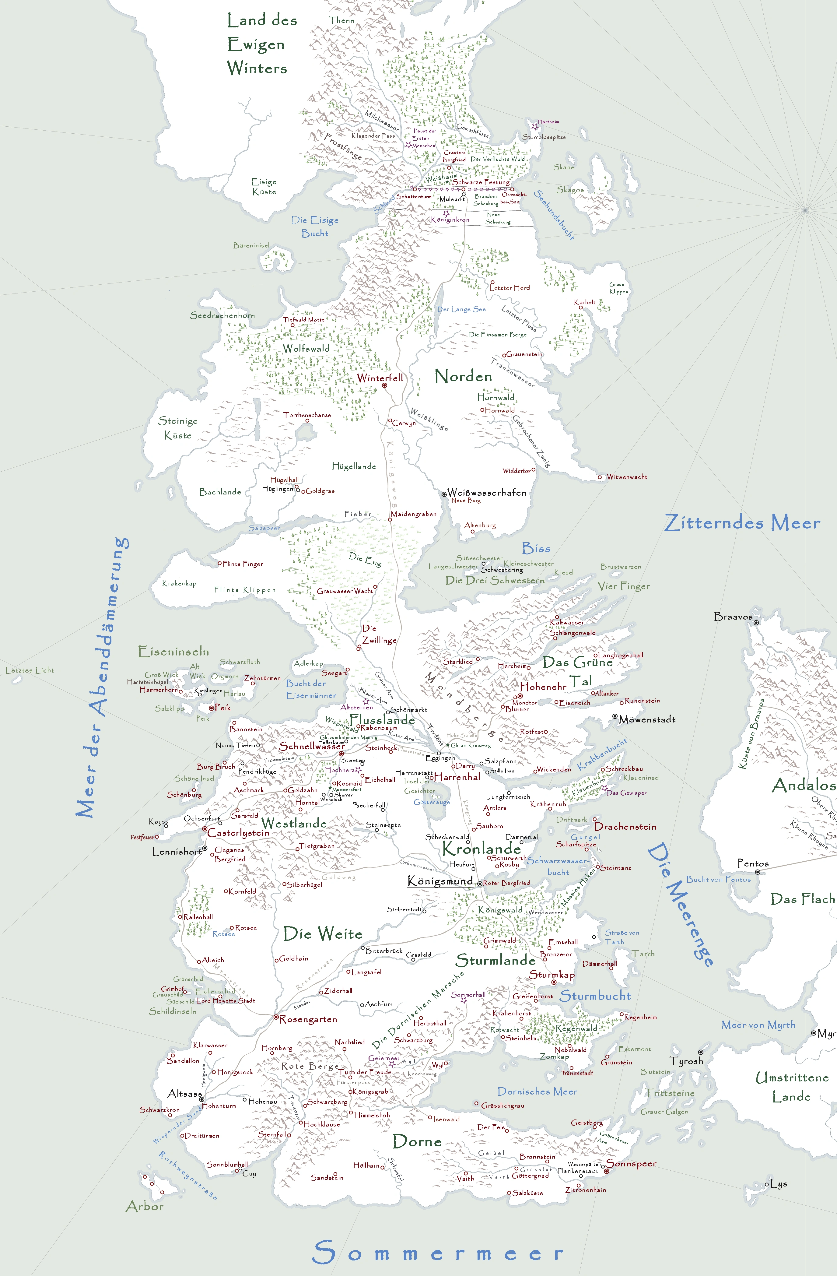 | Orte | Einsames Kap • Eisige Küste • Faust der Ersten Menschen • Frostfänge • Gabelspitze • Höhle der Dreiäugigen Krähe • Klagender Pass • Land des Ewigen Winters • Mauer • Schlund • Storroldsspitze • Thenn (Region) • Treppe der Riesen • Verfluchter Wald |