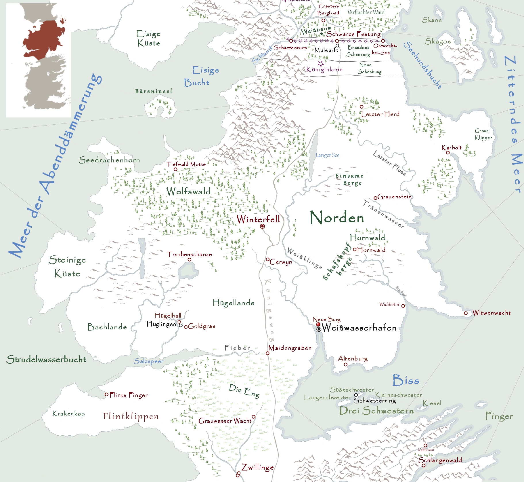 | Besiedlungen | Altenburg • Bruchsteinberg • Burg Cerwyn • Deepdown • Driftwood Hall • Flints Finger • Goldgras • Grauenstein • Grauwasser Wacht • Hornwald • Hüglingen (Hügelhall) • Karholt • Königshaus • Letzter Herd • Schwarzweiher • Tiefwald Motte • Torrhenschanze • Weißwasserhafen (Neue Burg - Wolfsbau) • Widdertor • Winterdorf • Winterfell • Witwenwacht |