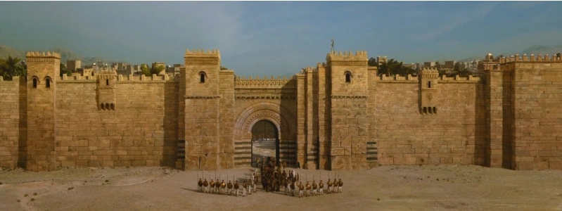 - Stadttore: Die äußeren Stadttore sind mit Kupfer beschlagen, die mittleren mit Eisen, die innersten aber mit Augen aus Gold gespickt.[3]