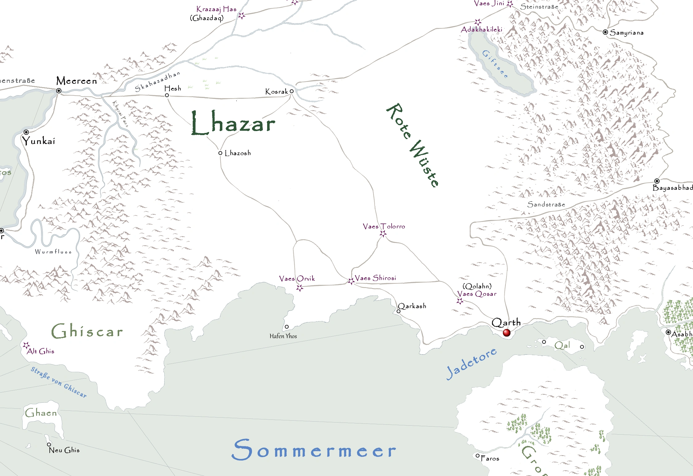 Einst erhoben sich im Gebiet, welches heute die Rote Wüste bildet, die stolzen Stadtstaaten der Qaathi von welchen nur noch Qarth übrig geblieben ist. Alle anderen Städte sind schon vor Jahrhunderten von den Dothraki zerstört worden. In gewisser Weise führte dies zum Aufstieg von Qarth. Die Qaathi waren gezwungen den Blick aufs Meer zu richten und die Reingeborenen bauten eine Flotte und rissen die Kontrolle über die Jadetore an sich. Somit hatten sie die kürzeste Ost-West-Passage unter ihrer Kontrolle und profitieren seitdem einerseits enorm vom Handel und können andererseits Zölle für die Durchquerung der Jadetore erheben.[7]