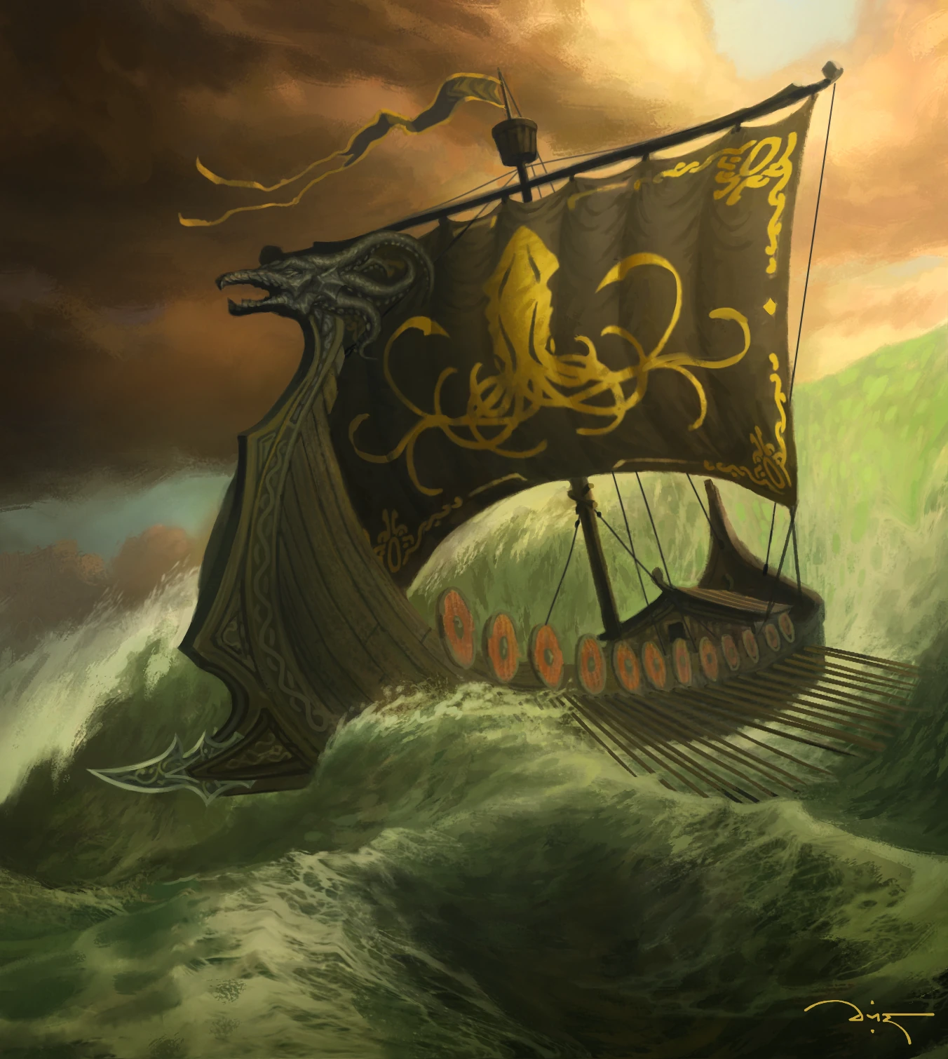Sie hat einen schlanken, schwarzen Rumpf von etwa 30 mtr. Länge, einen einzelnen Mast und Platz für 50 Ruderer unter Deck. Auf Deck ist genug Platz für 100 Männer und sie besitzt eine eiserne Ramme in Form einer Pfeilspitze am Bug.[1]