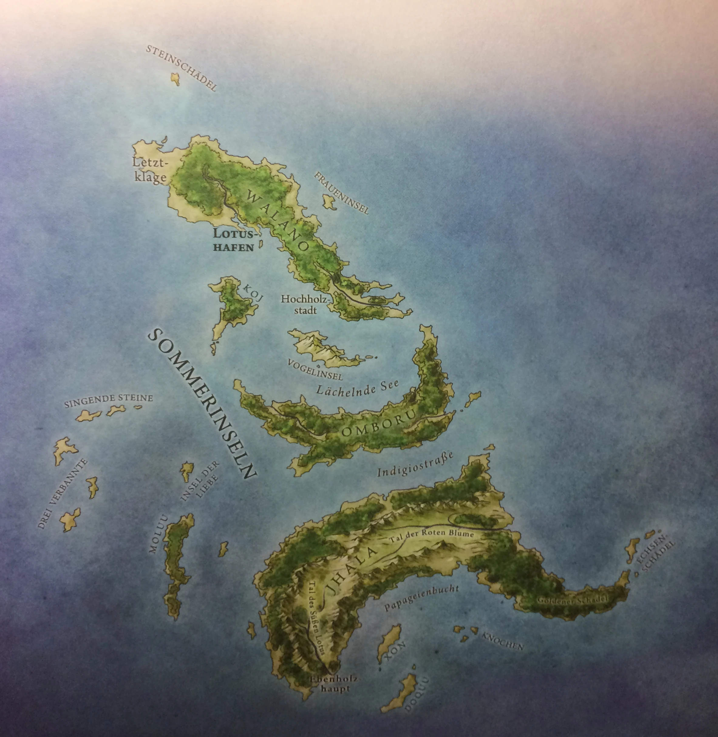 Jhala ist die größte der über fünfzig Sommerinseln. Sie erstreckt sich von Spitze zu Spitze über zweihundert Wegstunden. Unter den hohen grünen Bergen breiten sich bei beständig mildem Wetter riesige Wälder aus, dampfende Dschungel, Strände aus grünem und schwarzem Sand, mächtige Flüsse, in denen es von riesigen Krokodilen wimmelt, und fruchtbare Täler.[1]